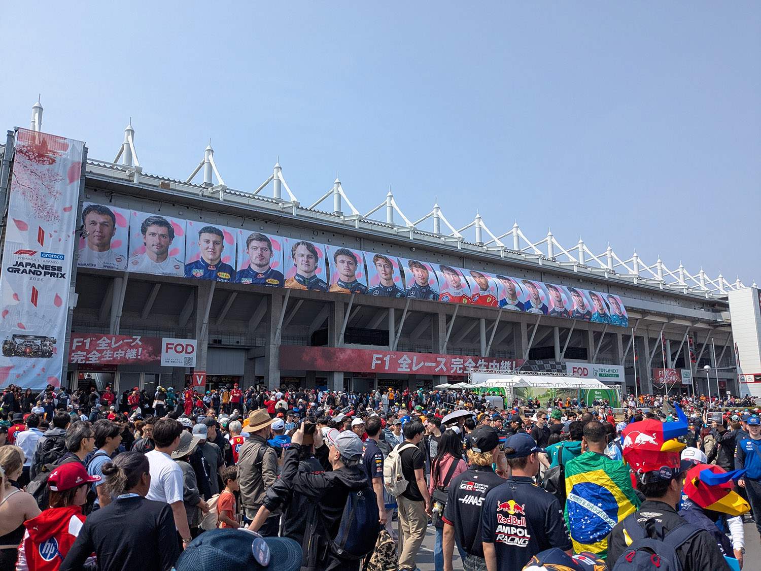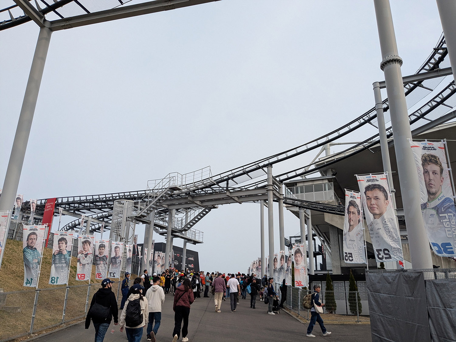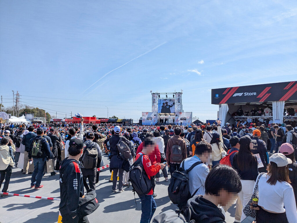 何時くらいに着いたのかな。ゆっくり目に行ったので11時半くらいにグランドスタンド裏に着。いやはやとんでもない人です。金曜も凄かったですが当然ながらそれ以上。本当にF1人気が凄い事になってきましたね・・まあ去年のチケット販売のタイミングは角田君がまだどうなるか分からなかったというのもありますが、写真にもありますようにフジテレビが相当力を入れてきているのもありますし来年どうなるかはとても興味がありますね。もしかしたら角田君がまた復活して走るかもしれませんので。