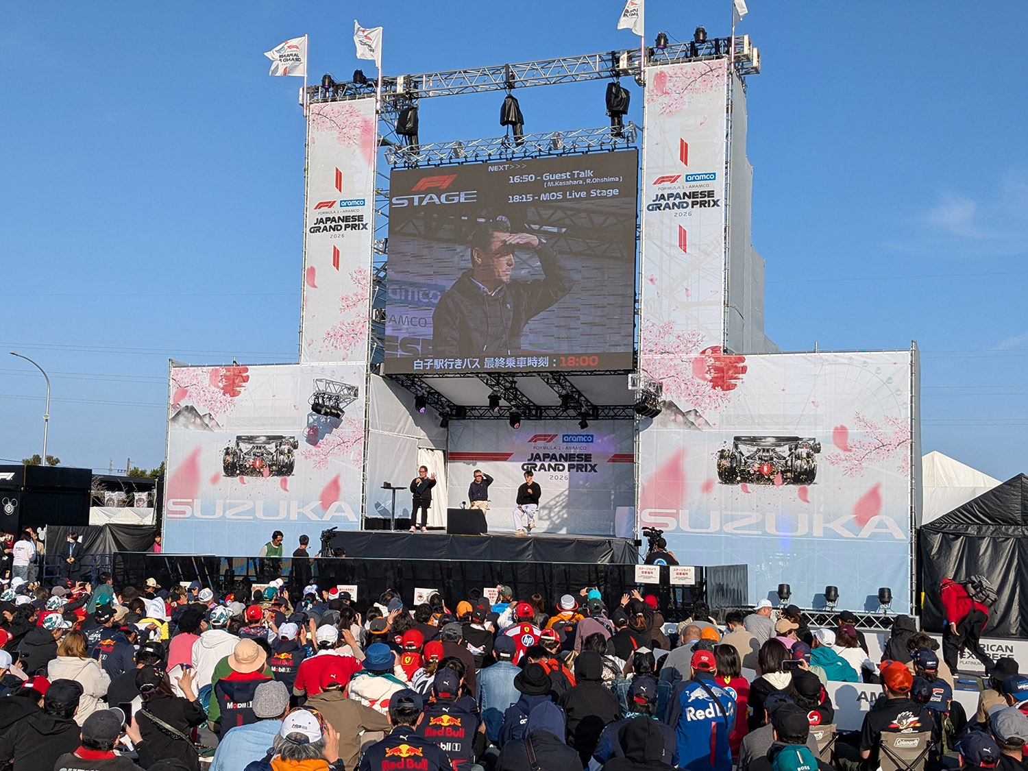 FP2も終わってさあ帰ろうかとグランドスタンド裏に行くとちょうど中嶋悟さんと佐藤蓮選手がトークショーをしていました。ナカジマレーシングの監督とドライバーと言う立場ですが、私はやはり中嶋悟さんが永遠の憧れのドライバーですね。普段このようなトークショーは見ないのですが思わず少し聞き入ってしまいました(笑)