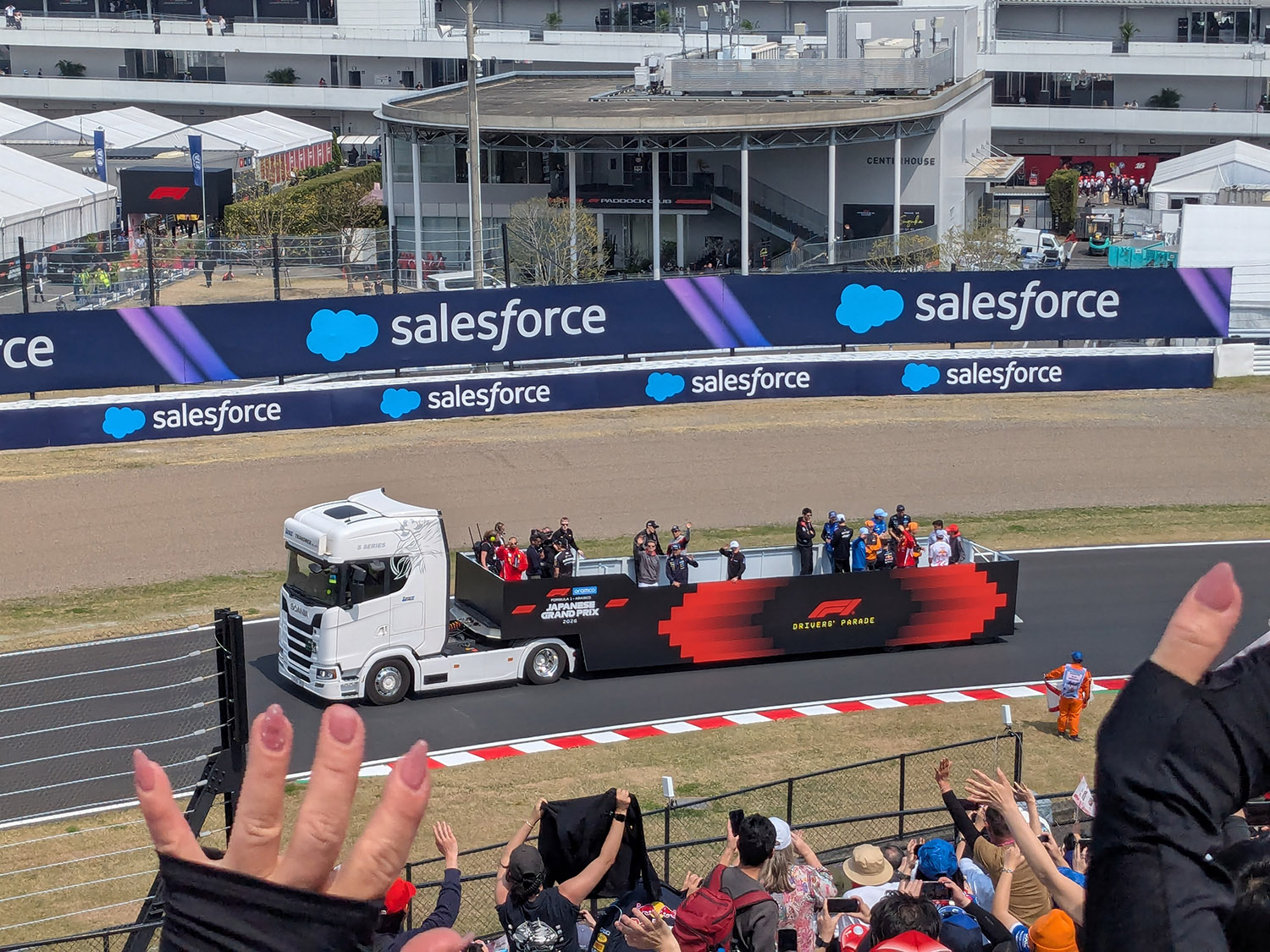 ドライバーズパレード。今年はトレーラーに全員載せての運行でした。去年まではクラシックカーに1人ずつ乗ってのパレードだったんですけどね。