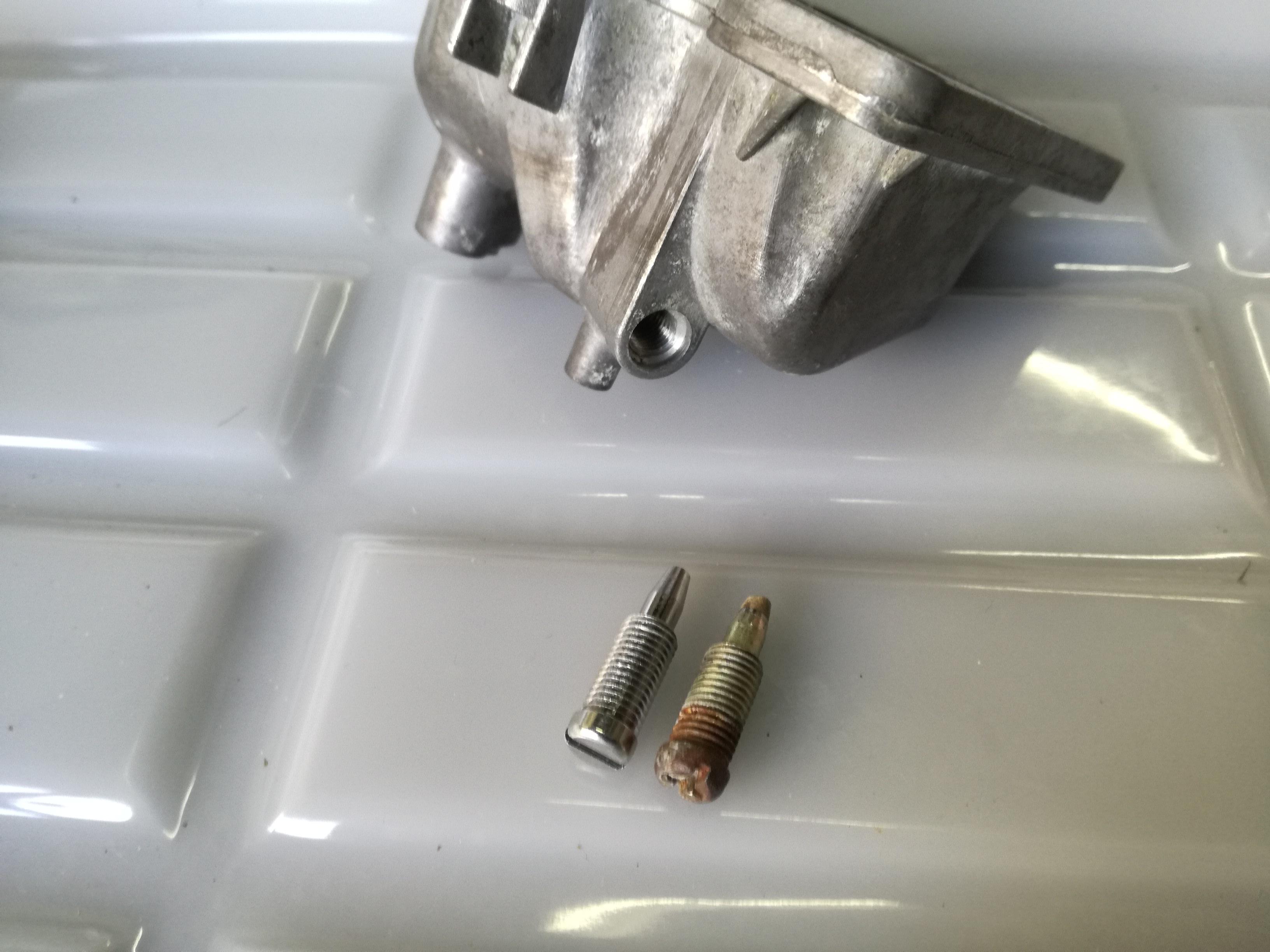 キャブ内のガソリンを抜く際、これを緩めれば中身を抜けます。が、あまり抜く機会も無いし、抜かずに取り外すことが殆ど(自分だけ?)なので、どのキャブを見てもこのネジは固着してるというか、外された形跡があまりありません。よって、ネジの腐食は結構進んでたりしますし、ここにたまった微量の錆がキャブ内に回ることもあるので、ここを交換出来るのもありがたいです。交換の際は掃除はしっかりしましょう。