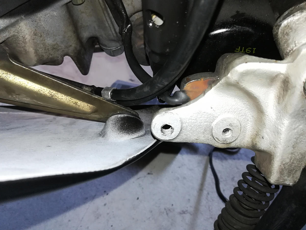 その後ジャッキをゆっくり下げていくのですが、スイングアームを固定しているメインシャフトを少し緩めないと、フレーム自体でエンジンを挟むような形状のため、そこからエンジンが抜けないので、スイングアームのメインシャフト部分も緩めます(取り外しはしません)。
