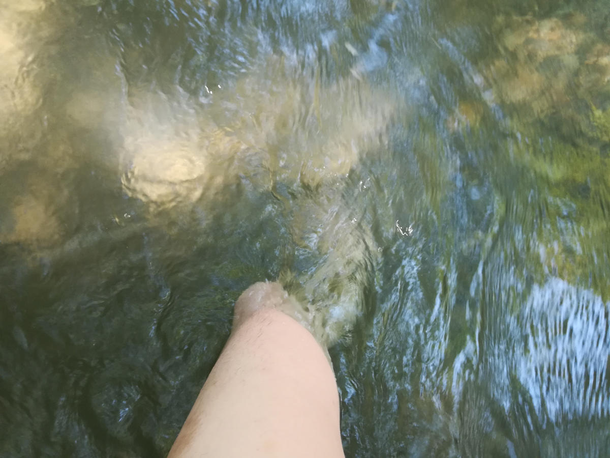 レザーパンツを脱ぎ、ブーツも靴下も脱ぎ、パンツ一丁(笑)で川へ進入。