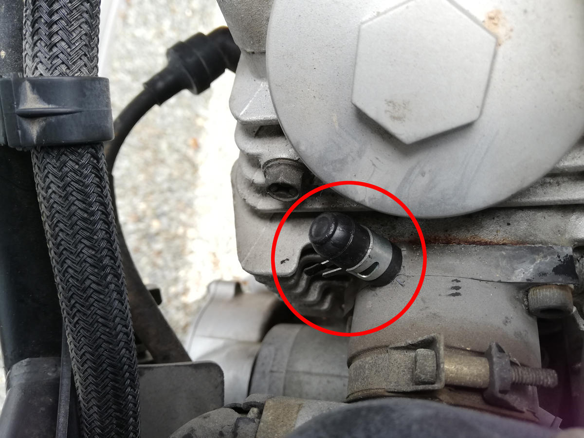次はこちら。シリンダーとキャブを繋ぐマニホールド(インシュレーター)に繋がっているホースを抜きます。が、ここが熱で固着しており抜くのが大変でした。抜いた後はヤマハ純正のキャップ(16G-13569-00)を使って塞ぎます。