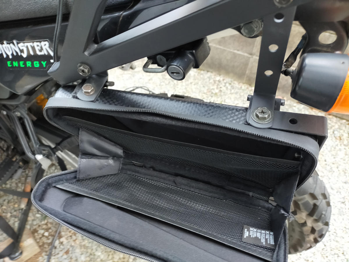 以前からバイクサイド部分に小さいバッグを常設したいと思っていました。入れるものは林道で何らかのトラブル?があった際の応急用工具。バイクでどこか走りに行く際は必ず中容量のリアバッグを固定していくので、そこに入れればOKなんですが、余ってる工具をピックアップするとまあまあな重量になり、それをリアバッグに何時も入れておくのは持ち運びの面からも出来れば避けたいし、容量が減るならそれ以外に入れられるものも増える訳なので、何とかしたいなーと思ってました。