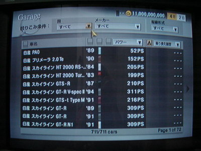 ※ステータス画面。110億crと711車種があります。名前もここに出ますね(笑)。