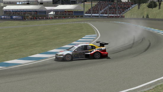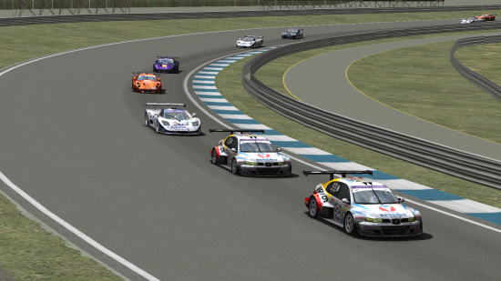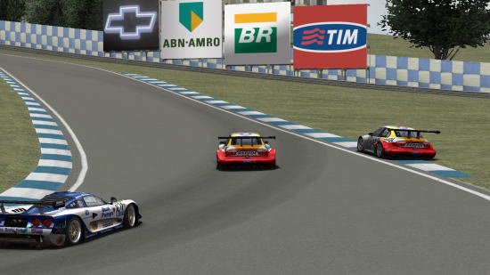 JOINしようとするとコースファイルが無い、とのメッセージが・・。慌てて調べてみると私がインストールしていたのは古い?方のコースデータで、今回のはバージョン2.0という新しい方のコースデータでした。直ぐにNogripへ行ってコースデータをDLし、インスト後に即入りなおして事なきを得ました;;。このコースは最終セクションから前半セクションまではかなりの高速区間が続きますが、中間部分は低速コーナーの組み合わさったコーナー群で、セッティングの方向性をどうするか結構悩みどころです。とりあえず若干ダウンフォースを付け気味でウイング2/7、ギア比は低速区間を考えて1速を使うセッティングにしました。それがピタっとはまり、予選ではPP獲得。しかしこのコースは見た目以上にアンジュレーションがあるので、ブレーキングが難しいコーナーが何箇所もあります。その辺りを気をつけながら決勝は走らないと直ぐにスピンする可能性があります。決勝は12周ですので、とにかくミスを少なく走りきる事を念頭に置いてスターティンググリッドに並びます。