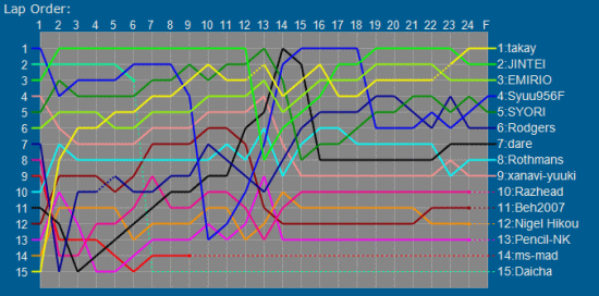 そしてレーススタート。まずはFerrari575のJINTEIさんとムルシエラゴのDaichaさんが逃げます。xanavi-yuukiさんとSyuu956Fさんがミスされて2周目には3番手に。その後すぐSyuuさんが追いついてきたのですが、ペースを見る限り、どう考えても2ストップと判断したので先に行ってもらい4番手に。その後Daichaさんがミスされて3番手に上がります。8周目頃にSyuuさんがピットインされ2番手に。しかし予選最後尾から追い上げてきたtakayさんが速攻抜いていきます;;。しかしミスされてまた2番手に。12周目でJINTEIさんがピットインしトップ浮上。JINTEIさんとtakayさんがFerrari575ですが、速い割りに燃料が持つなーと思ってました。きっと2ストップだろうと思ってました(笑)。