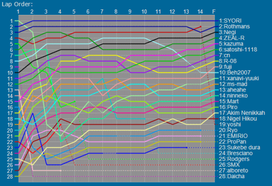 スタートのタイミングがバッチリ決まったのですが、1速のギア比が高かったのか思ったより伸びなく、逆に完璧なスタートを切ったRothmansさんが真後ろに来ます。イン側をキープして入られないようにブロック気味に走り、アウト側に行ってもらうようにしたらアウト側に行かれたので助かりました(笑)。そのまま1コーナーをインを通過した私がトップ、2番手にRothmansさんが通過し、xanavi-yuukiさんが3番手と青写真通りの展開になってちょっと感動でした(笑)。