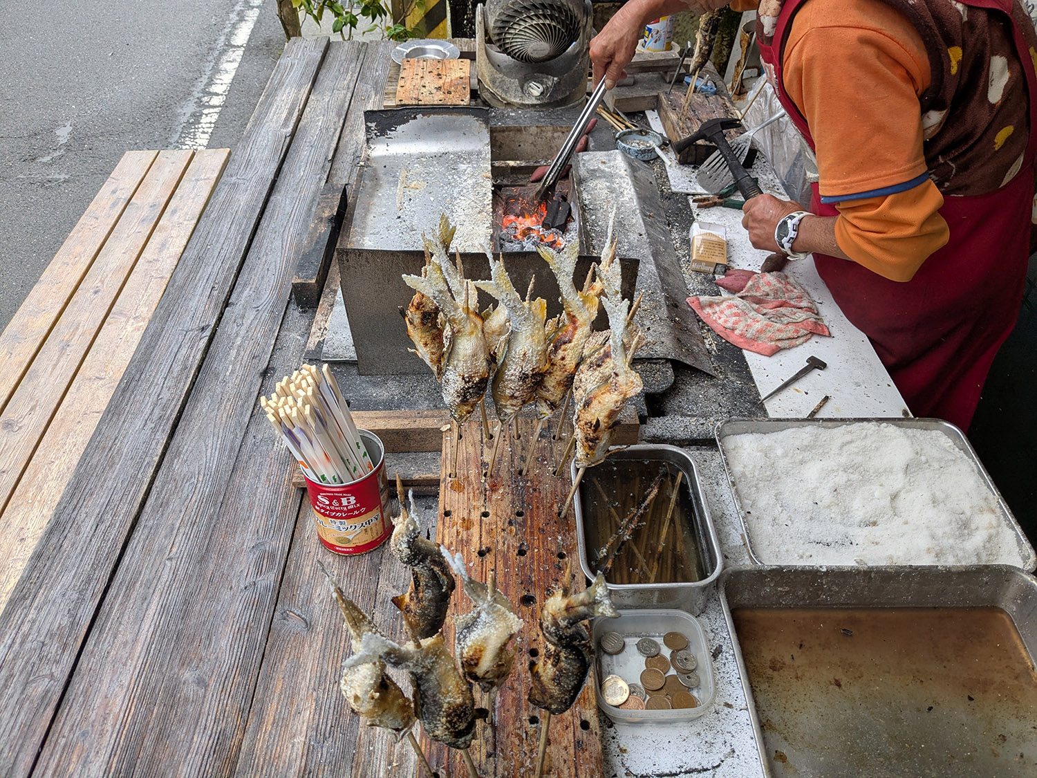 そしてここに辿り着くまで他に寄りたい箇所もありましたが、雨とかでペースも遅く時間が押してるので急遽目的地まで一気に進みます。場所は洞川温泉(奈良県吉野郡天川村)の炉端焼き亀清さん。凄い人気のある店で鮎やイワナなどの塩焼きや活造りなどを提供してくれているお店です。あいにくの雨だったので並んでる人もおらず直ぐに買う事が出来てラッキーでした。