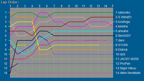 決勝です。PPはEldrickさん、2番手にsatorukoさん、3番手になんとtorafuguさん!。いきなり予選で負けてしまいましたorz。5番手にS Wind51さんとPUSH部屋出身の方々に挟まれます(笑)。