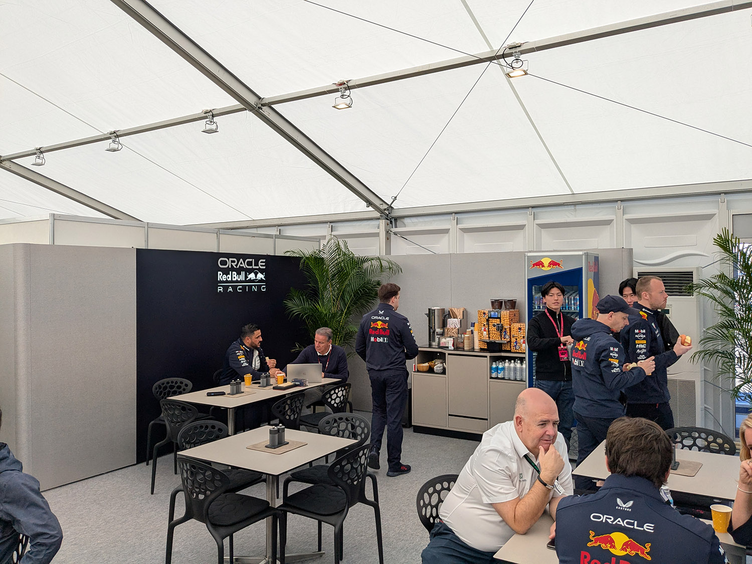 アルファタウリの時はピット後方が全てゲストと関係者のスペースになっていたんですが、レッドブルのゲストエリアはピット内中央の狭い一角のみ。見た感じや印象的にあまりゲストに入ってきてもらいたくないという感じなのかなという印象でした。
