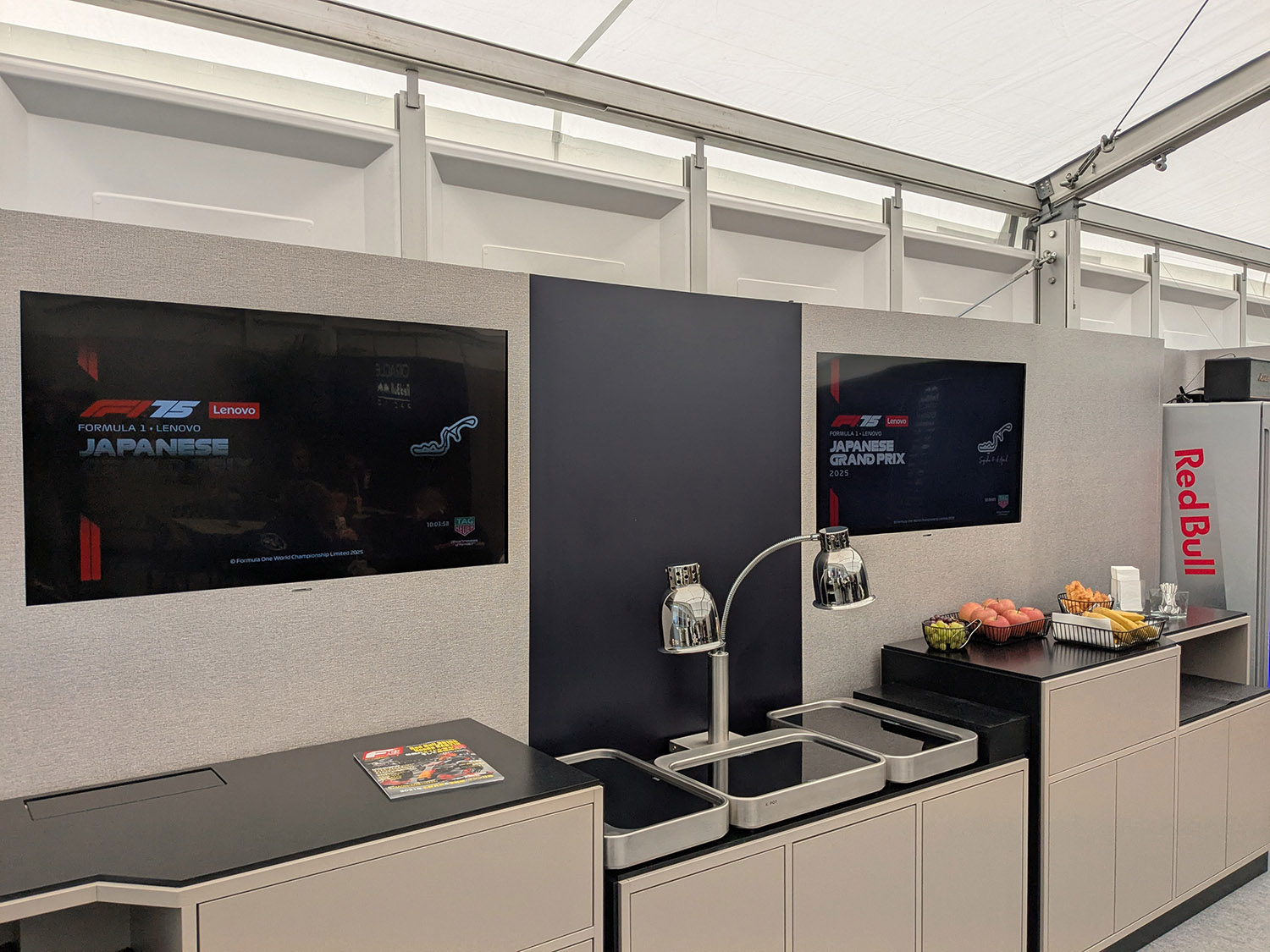 ピットから一旦退去する時に最後に撮ったゲストエリア。結構狭いですよね。ヘッドセットとゲスト用のモニターが見えます。FP1が始まったらここに来るのか・・やばいですね・・
