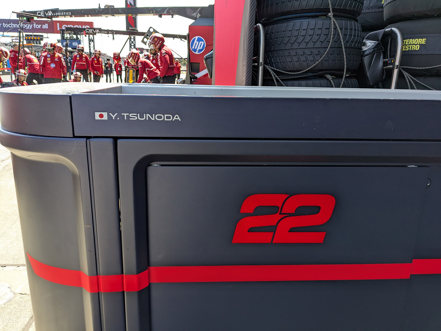 ピット内の入り口手前に22のステッカーが貼ってある大きな収納ラック?のようなものが。このゼッケンを見るだけで気分が高まります!