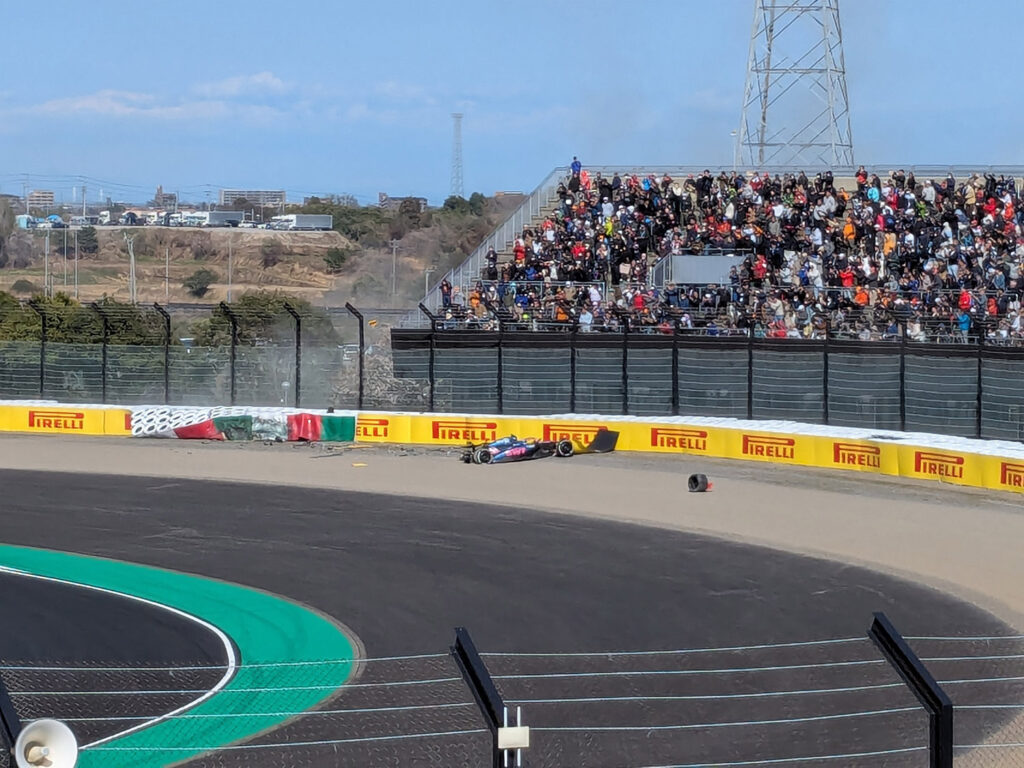 その後は適当な写真しか残ってなかったのですが(笑)、芝生が燃えるという赤旗が4回(だったかな)出て、まともなプラクティスにならず終了。角田君も全くセットアップを進めることが出来なかったみたいで残念でした。相当乾燥していたことと風が強いというのが重なり、マシン底から飛び出る火花が芝生に引火したという事のようですが、去年はそのような事が起こらなかったのに今年は何故なんでしょうね。まだ芝生が生えてきていないので(全体的に茶色いので)燃えやすい状態だったんでしょうか。去年春開催時の写真を見返すと少し緑が見えてますので、やはり今年はまだ芽が出ておらずカラカラの状態だったのでしょう。